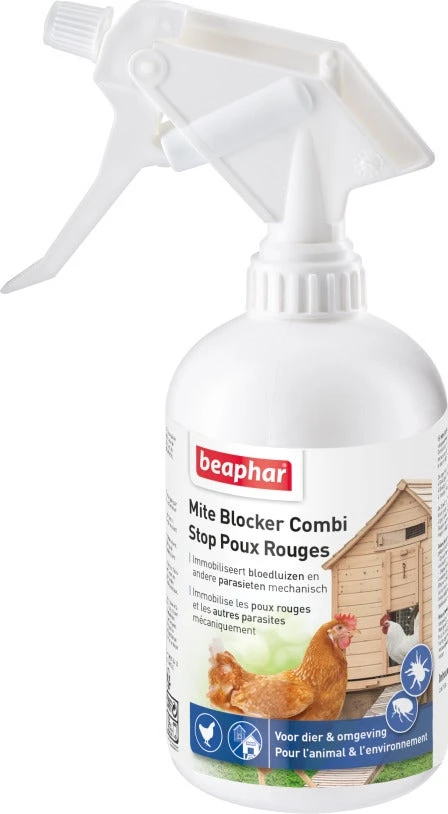 Afweermiddel Mite Blocker Combi spray van Beaphar is speciaal ontwikkeld voor volièrevogels en hoenderachtigen zoals sierkippen, fazanten en kwartels en hun omgeving. Deze spray op basis van dimethicon immobiliseert bloedluizen, mijten, luizen, vlooien, teken en andere parasieten.