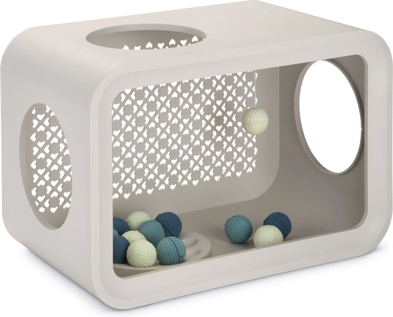 De Beeztees Cat Cube Play in de kleur grijs, is een open cabine waar je kat lekker kan spelen. Deze module is voorzien van 12 losse kattenballetjes en een balletje aan een leuk touwtje. Ideaal voor uw huisdier! Afmetingen: 49 x 29 x 32,6.