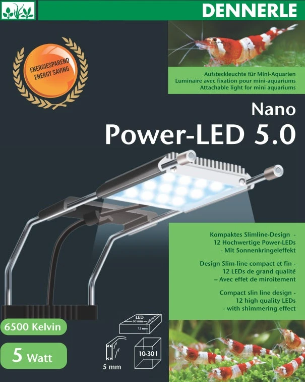 Nano aquarium verlichting Power LED van Dennerle heeft een compact slimline design met 12 hoogwaardige power-leds, met glinsterend effect. De kleur van het licht is daglicht (kleurweergave: zeer goed), dit is uitstekend groeilicht voor aquariumplanten. De aluminium behuizing is van hoge kwaliteit en de bevestigingsstaven zijn van roestvrij staal. De lamp is horizontaal en verticaal verstelbaar.