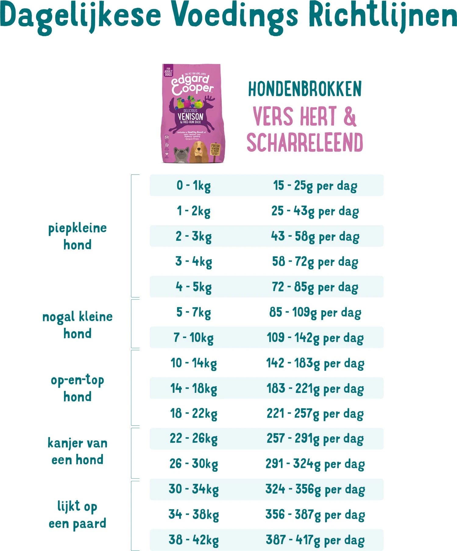 Dit hondenvoer van Edgard & Cooper en is speciaal ontwikkeld voor volwassen honden. Met de heerlijke smaak van hert en scharreleend.