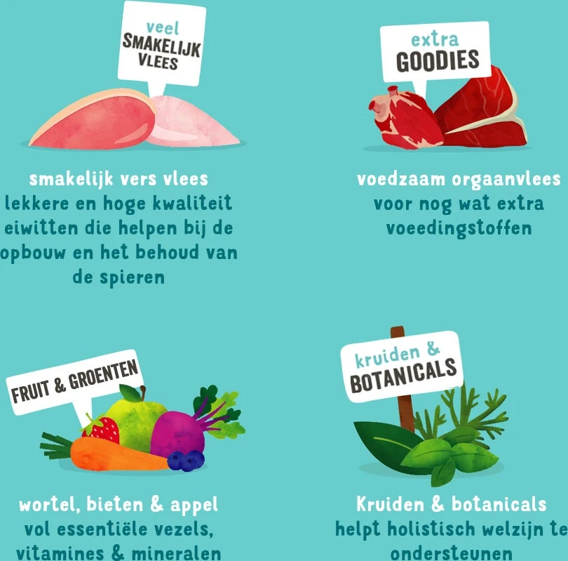 Bijna elke hond vindt recepten met véél vers vlees onweerstaanbaar. Als bonus doen ze er veel natuurlijke superfoods bij die je viervoeter een extra vitamineboost geven.