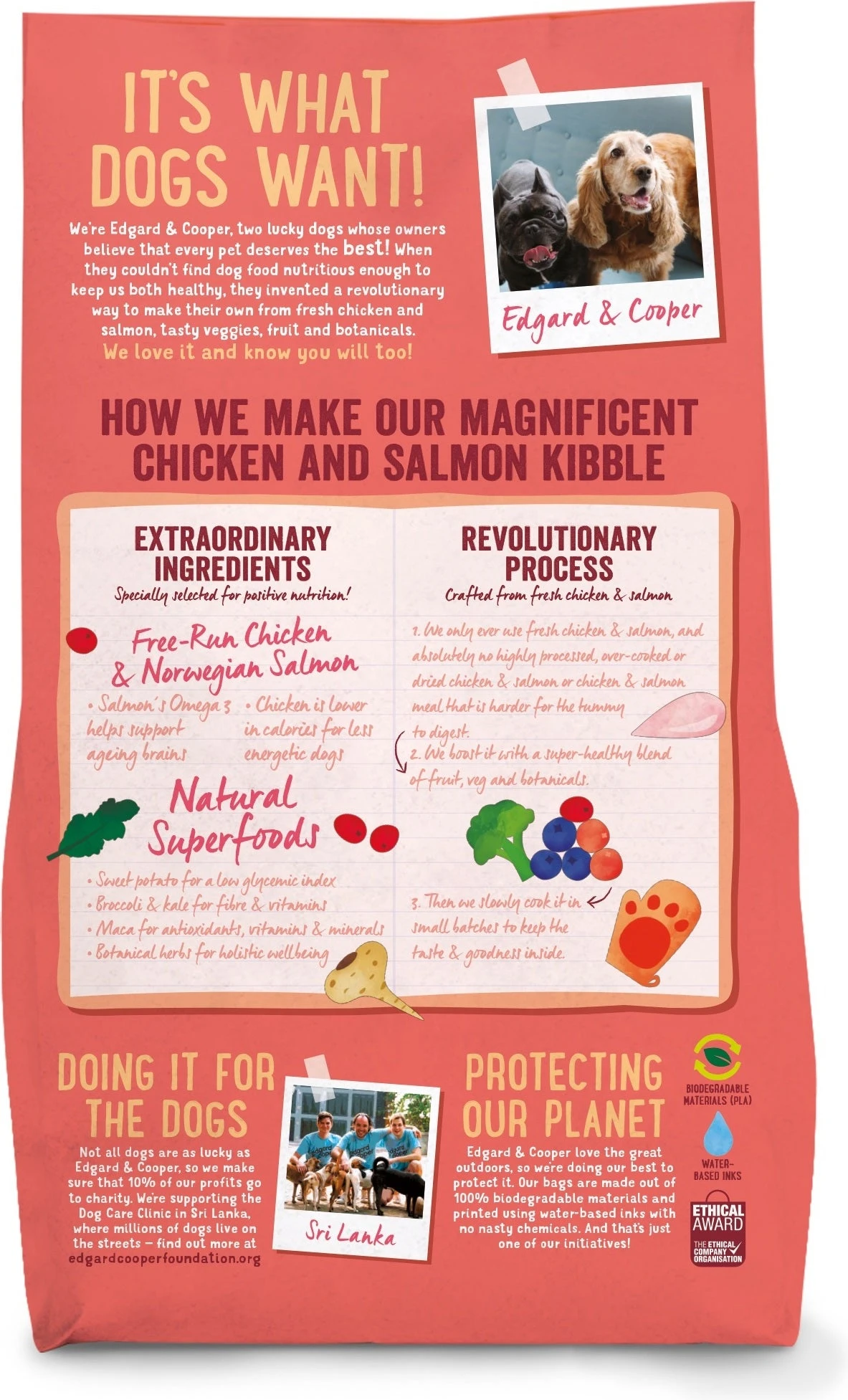 Goed eten is top voor lichaam en geest. Niks beter dan lekker vers vlees met groenten en fruit. Zeker als het gemaakt is met een hart voor de natuur. Maar: meestal is dierenvoeding overbewerkt en verpakt in plastic. Daar hebben wij het helemaal mee gehad. Jij ook? Geef je lievelingen dan Edgard & Cooper: écht lekker eten voor honden en katten dat jou, je viervoeters én onze planeet goed doet.