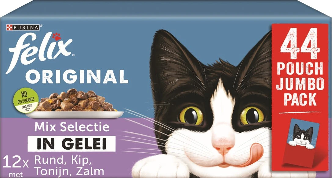 Slimme katten weten wat ze willen, vooral als het om eten gaat! Daarom zijn de Felix Original recepten met kwalitatief hoogwaardige ingrediënten gemaakt en bereid met malse stukjes in een heerlijke gelei. Deze Mix Selectie vormt ook een bron van essentiële Omega 6-vetzuren met de juiste combinatie van vitaminen en mineralen die jouw kat klaar zullen maken om nog meer kattenkwaad uit te halen.