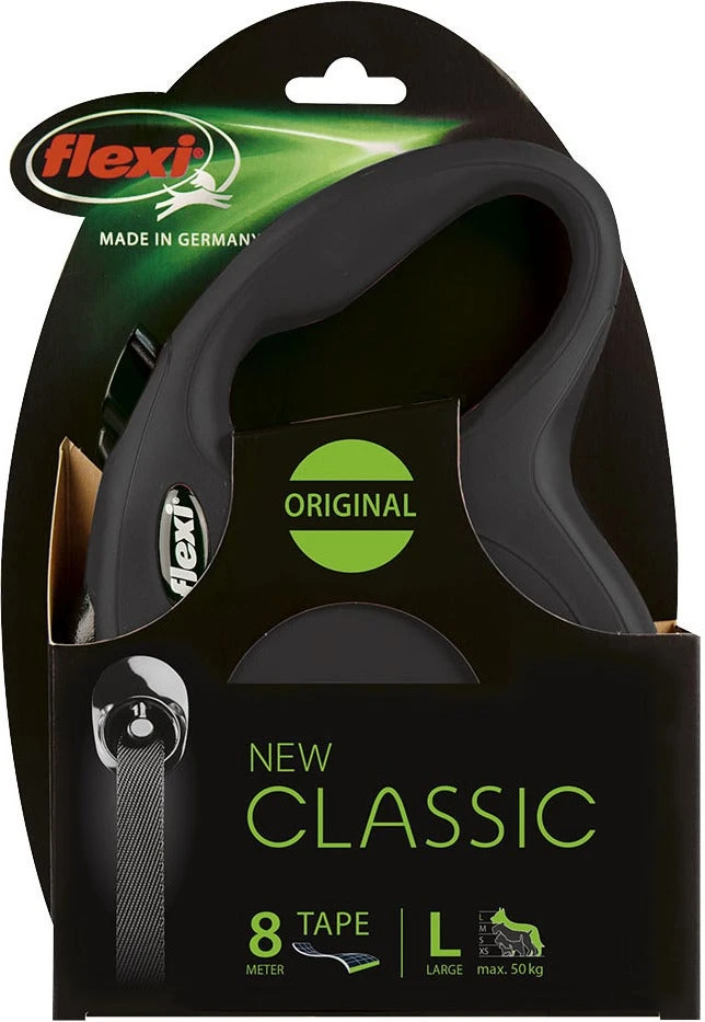 De rollijn Classic Tape van Flexi is een moderne klassieker met een maximale vrije looplengte van 8 meter. Deze hondenriem is geschikt voor grote honden tot ongeveer 50 kg.