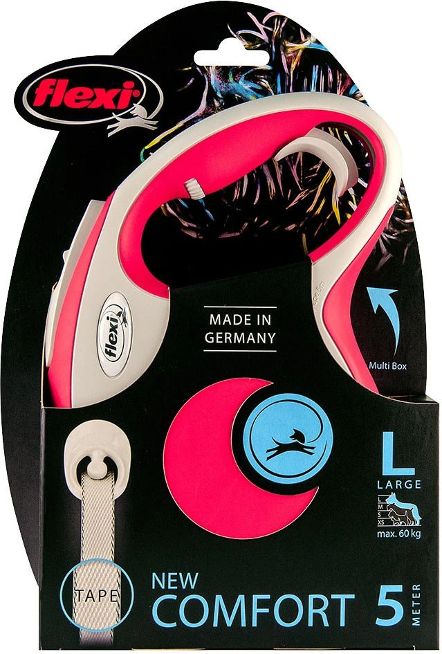 De rollijn New Comfort tape van Flexi is door het perfect afgestemde, tweekleurige design een echte blikvanger. De hondenriem heeft een maximale vrije looplengte van 5 meter en is geschikt voor grote honden tot maximaal 60 kg.