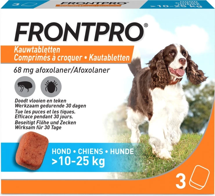 Frontpro werkt snel en effectief tegen vlooien en teken. Eén smakelijke kauwtablet gaat 30 dagen mee en doodt vlooien binnen 8 uur en teken binnen 48 uur. Daarnaast doodt de kauwtablet vlooien voordat ze eitjes kunnen leggen. Hierdoor voorkom je vlooienplagen in huis en geef je je hond een langdurige bescherming tegen vlooien en teken.