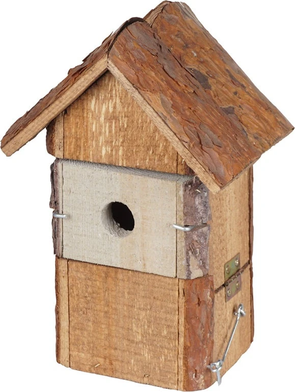 Deze nestkast van Intratuin heeft een invliegopening van 32 mm diameter, waardoor het geschikt is voor de boommus, huismus, pimpelmees, koolmees en de zwarte mees. Het dennenhout is behandeld met een niet giftige houtbeits op waterbasis. Aan de voorkant zit een afneembaar houten deurtje. Hang de nestkast eenvoudig op aan een schroef of een spijker. In de achterkant zit een gaatje geboord.
