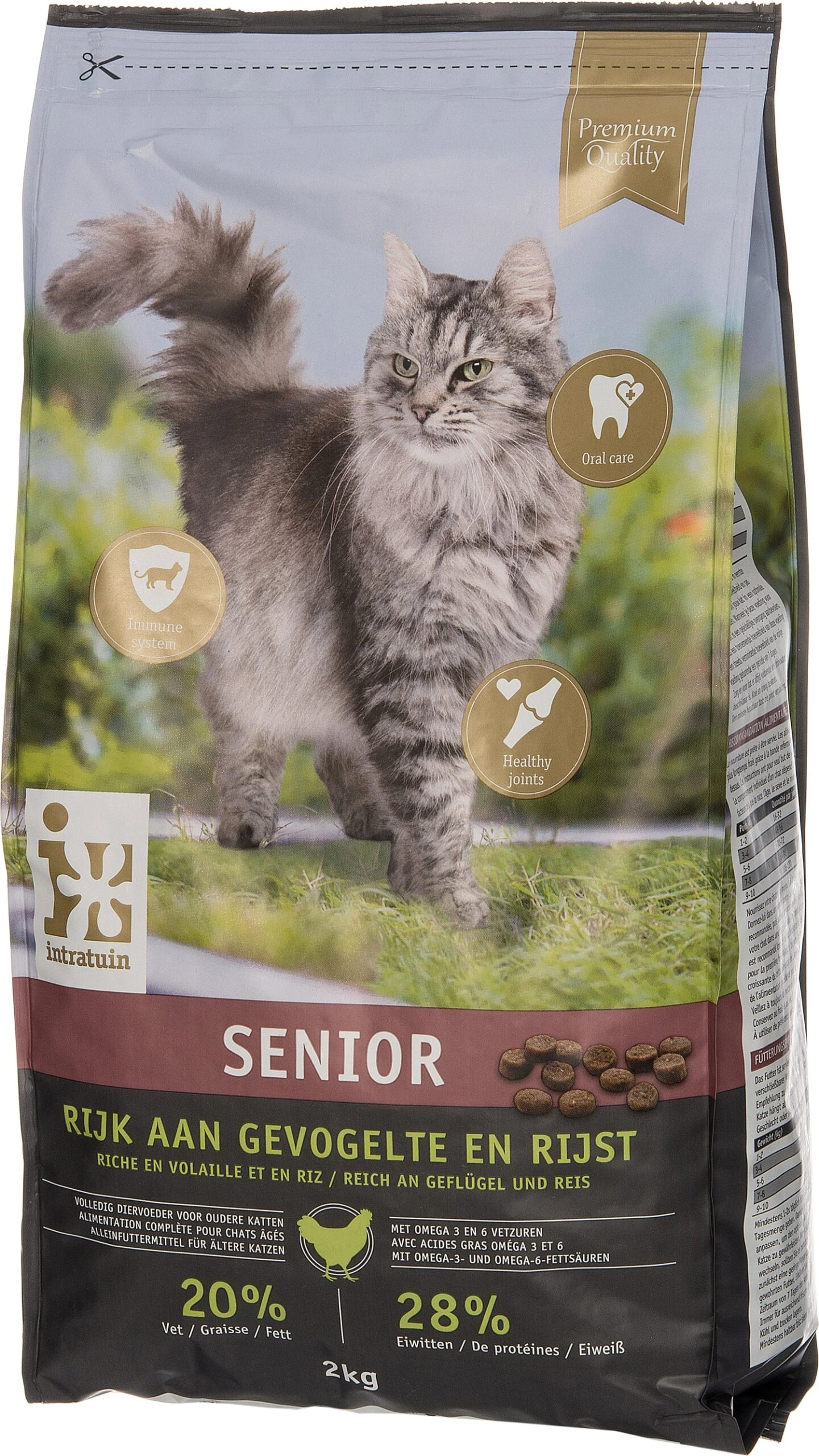 Het Premium kattenvoer senior van Intratuin is een volledig diervoeder voor oudere katten. Het droogvoer is geschikt voor alle rassen vanaf 8 jaar. De voeding heeft een optimale samenstelling voor oudere katten en is rijk aan gevogelte en rijst. De ingrediënten zijn van hoge kwaliteit en bevatten Omega vetzuren.