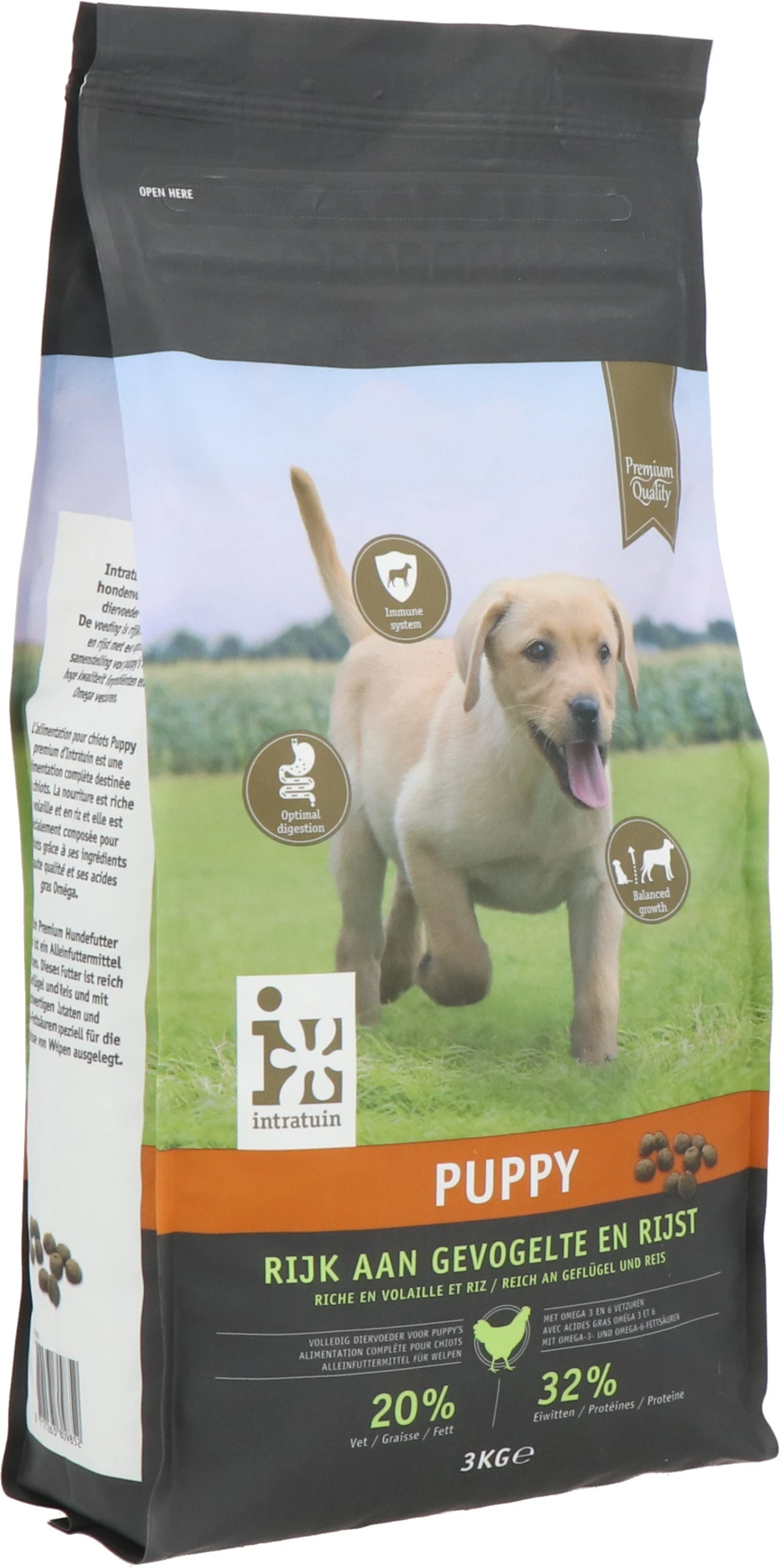Het Premium puppyvoer van Intratuin is een volledig diervoeder voor puppy’s. Het droogvoer is geschikt voor alle rassen vanaf 4 weken tot 18 maanden. De voeding heeft een optimale samenstelling voor puppy’s en is rijk aan gevogelte en rijst. De ingrediënten zijn van hoge kwaliteit en bevatten Omega vetzuren.