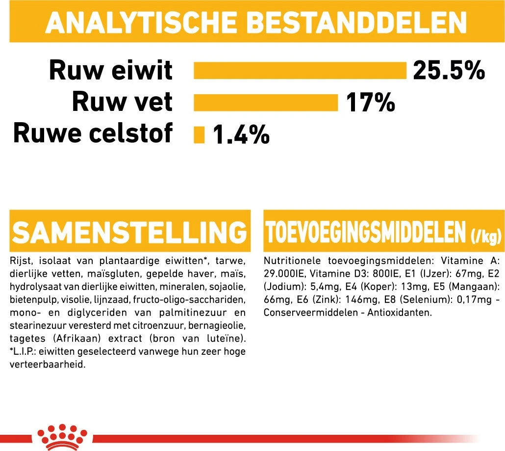 Binnen de Canine Care Nutrition reeks van Royal Canin valt de Dermacomfort voedingslijn, deze bestaat uit twee componenten: krokante brokken en een overheerlijk natvoer in een pouch. Beiden zijn compleet van samenstelling en vullen elkaar perfect aan.