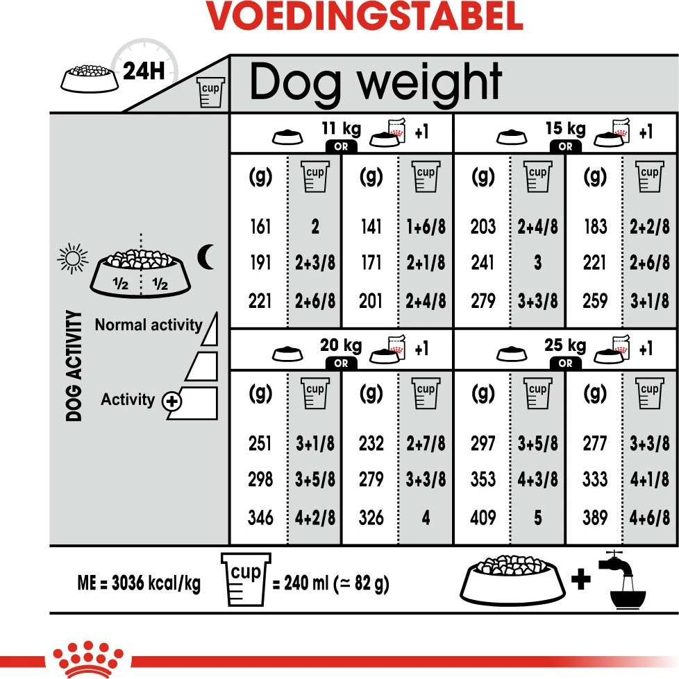 Daarnaast helpt een optimale combinatie van oplosbare en onoplosbare vezels je hond een vol gevoel te geven en ondersteunen deze vezels de gezonde spijsvertering. Royal Canin Light Weight Care Medium bevat maar liefst 21% minder vet bevat dan een normale voeding voor volwassen honden.