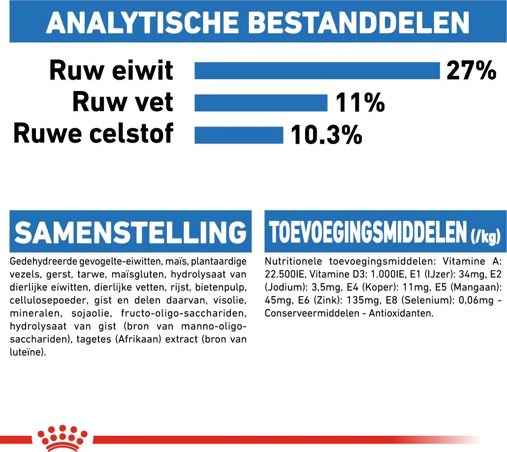Deze exclusieve formule bevat de Omega-3 vetzuren EPA en DHA, die helpen de gewrichten van jouw hond te ondersteunen. Royal Canin gebruikt alleen eiwitten van de hoogste kwaliteit, aangepast aan de behoeften van jouw hond. Deze formule is rijk aan zeer goed verteerbare eiwitten wat je hond helpt zijn spiermassa te behouden, terwijl zijn vet- en calorie inname worden verminderd.