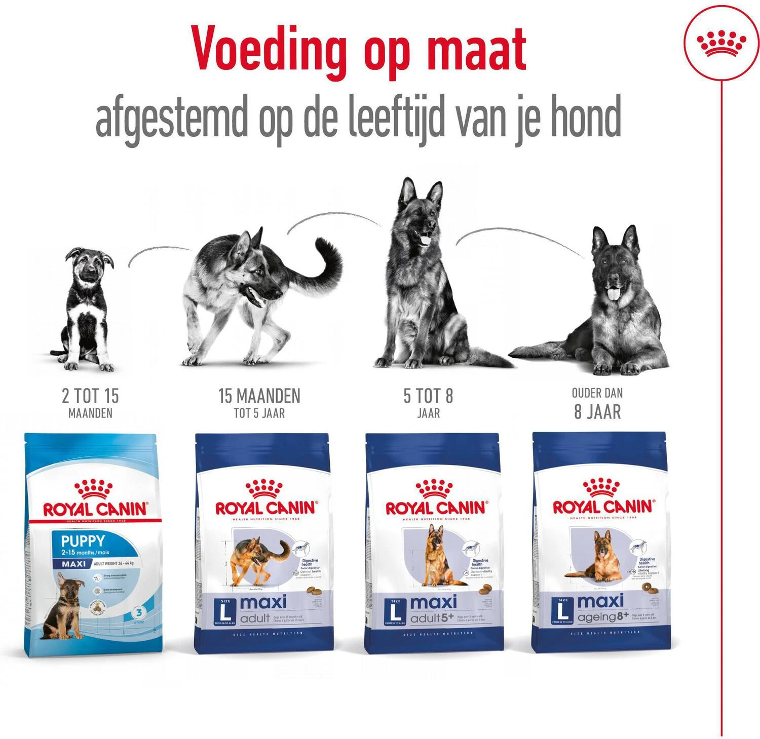 Royal Canin Maxi Ageing 8+ is samengesteld met de voedingsbehoeften van je oudere hond in het achterhoofd en is geschikt voor grote honden van 8 jaar en ouder, met een volwassen gewicht van 26 tot 44 kg. Deze hondenvoeding is ontwikkeld om gezond ouder worden van grote honden te ondersteunen en bevat een exclusieve samenstelling van antioxidanten en omega 3 vetzuren (EPA en DHA), wat helpt vrije radicalen te neutraliseren.