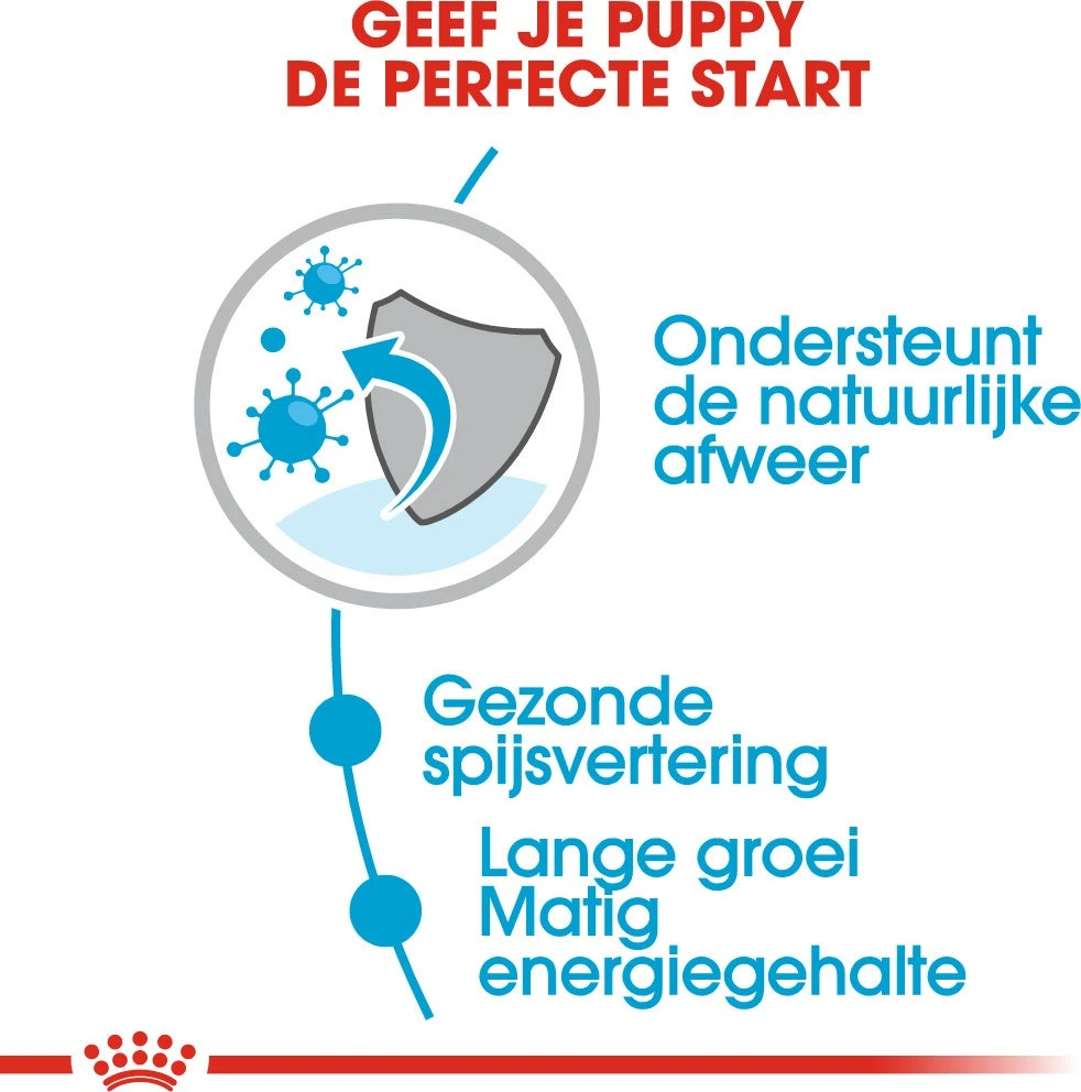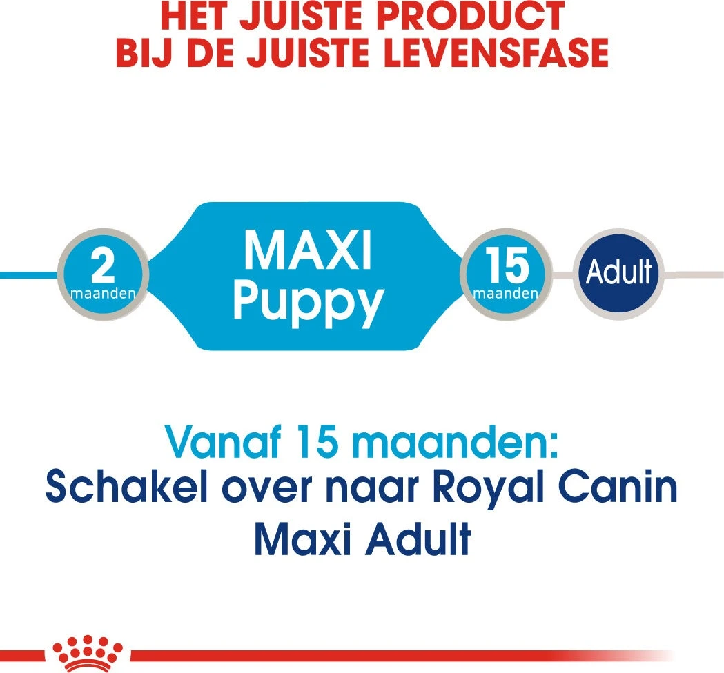 Maxi Puppy natvoer van Royal Canin is geschikt voor honden tot een leeftijd van 15 maanden, met een volwassen gewicht tussen de 26 en 44 kilogram, en is speciaal ontwikkeld met de voedingsbehoeften van je puppy van een groot ras in het achterhoofd.