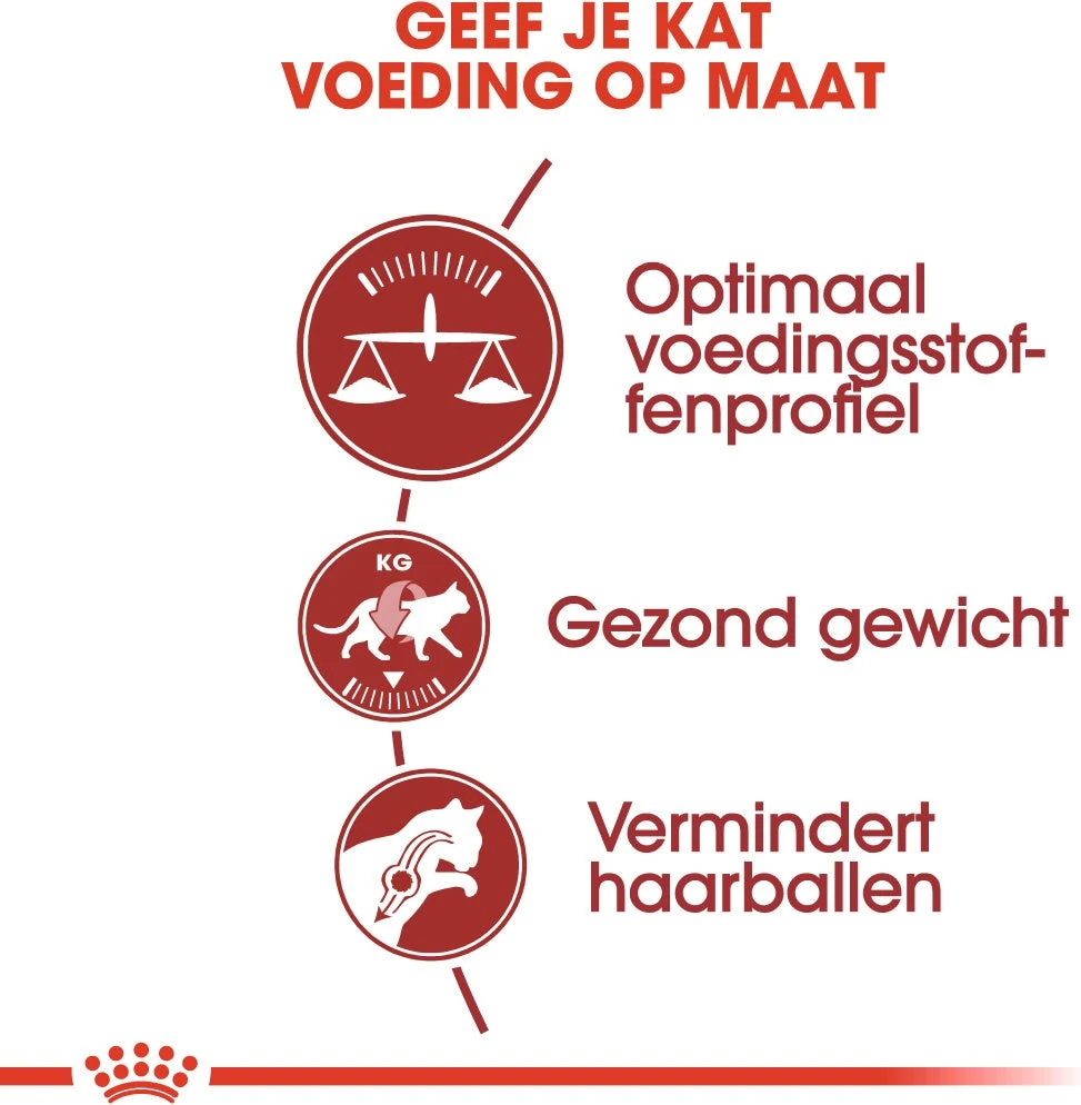 Haarballen kunnen bij jouw kat ontstaan uit de haren die jouw kat inslikt tijdens de verzorging van haar vacht. De specifieke voedingsvezels in Royal Canin Fit 32 helpen jouw kat van dit ingeslikte haar af te komen en verminderen zo de vorming van haarballen.