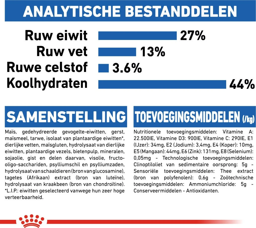 Royal Canin Indoor 7+ is verrijkt met specifieke voedingsstoffen zoals groene thee polyfenolen, vitamine C, EPA en DHA. Deze voedingsstoffen helpen je kat te ondersteunen bij de eerste tekenen van het ouder worden. Goed verteerbare eiwitten (L.I.P.) ondersteunen de spijsvertering. Eiwitten die goed verteerbaar zijn verminderen niet alleen de hoeveelheid ontlasting, maar helpen ook geurtjes te verminderen. Dat is niet alleen goed nieuws voor je kat, maar ook voor jou!