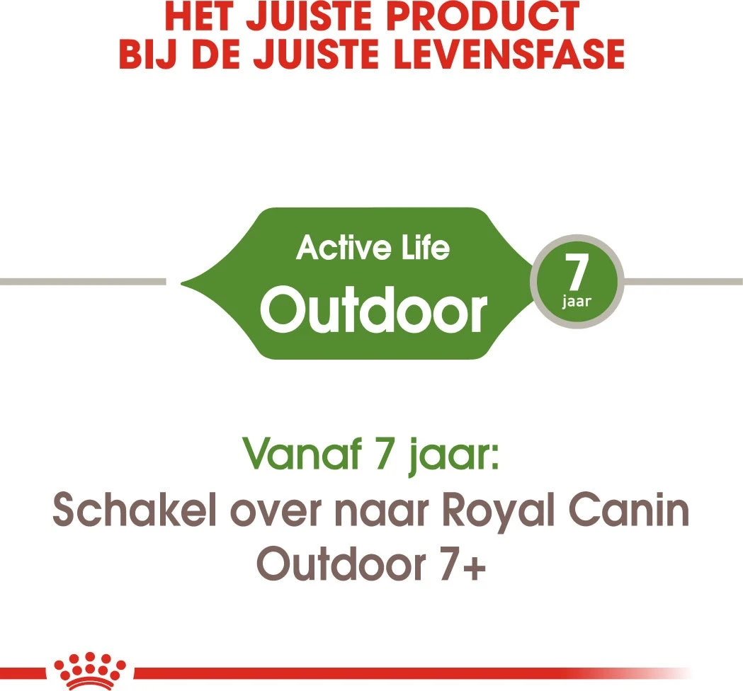 Royal Canin Outdoor bevat een hoog energiegehalte voor katten met een actief buitenleven. Het hoge energiegehalte helpt je kat om te gaan met de weersveranderingen gedurende de verschillende seizoenen. Het speciale antioxidantencomplex in deze kattenvoeding ondersteunt de natuurlijke weerstand van je kat. De aanwezige prebiotica ondersteunen een evenwichtige darmflora en daarmee een optimale spijsvertering. Exclusieve voedingsstoffen helpen de huidbarrière en een gezonde huid en vacht te ondersteunen.