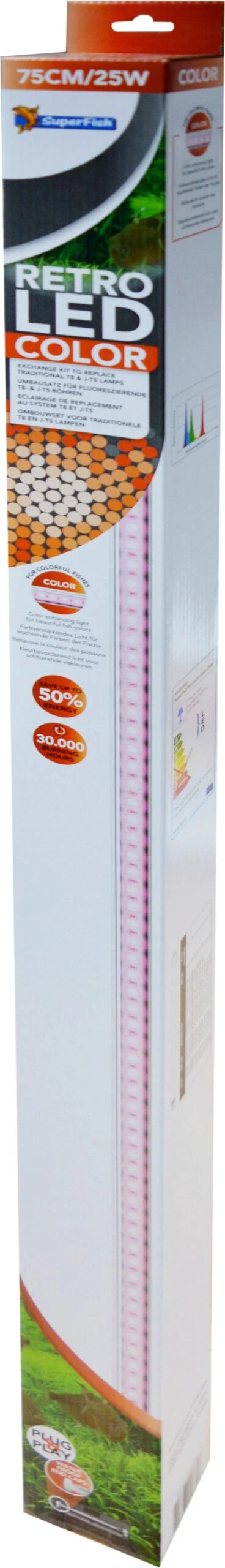 De SuperFish Retro LED lamp Color past perfect in een T8 of T5 aquarium armatuur en kan ook als extra verlichting of boven zelfbouw-aquaria worden toegepast. LED heeft een veel langere levensduur dan traditionele TL-lampen en verbruikt tot 50% minder energie.
