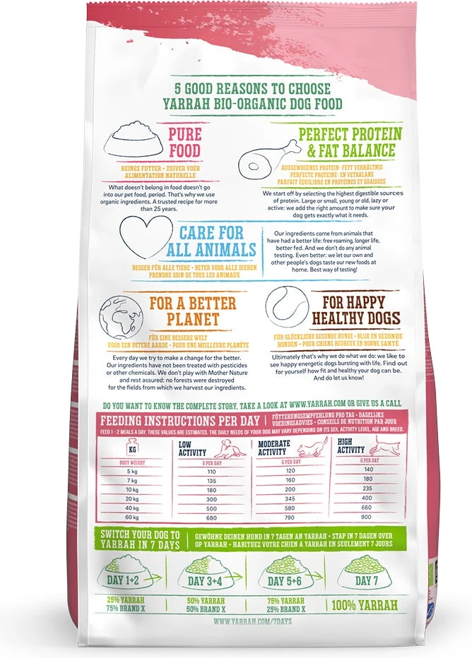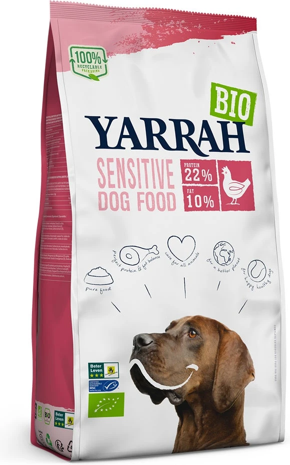 Yarrah Dog Sensitive Kip 2 kg is een heerlijke biologische hondenbrok met kip, rijst, zeewier en spirulina, ideaal voor honden met een gevoelige maag of problematische spijsvertering. Dit smakelijke voer van Yarrah is een volledige en complete, voedzame maaltijd voor de hond. Het is bijzonder geschikt voor honden die moeite hebben met het verteren van granen.
