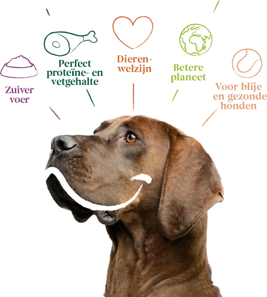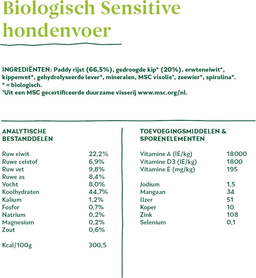 Het voer is zuiver biologisch en bevat dus geen chemische geur-, kleur en smaakstoffen. Wel krijgt jouw hond precies binnen wat hij nodig heeft door de hoogwaardige ingrediënten, zoals gedroogd vlees van scharrelkippen, paddy rijst, zeewier en spirulina. Dit maakt het voer gemakkelijk verteerbaar en rijk aan vitaminen en mineralen die zorgen voor een goede stoelgang, mooie vacht en en soepele spieren.