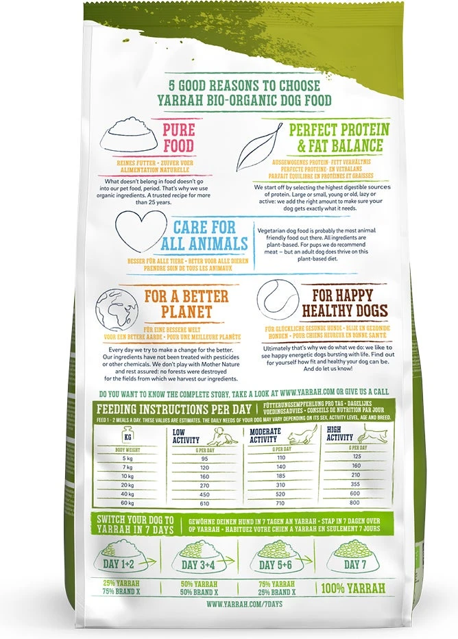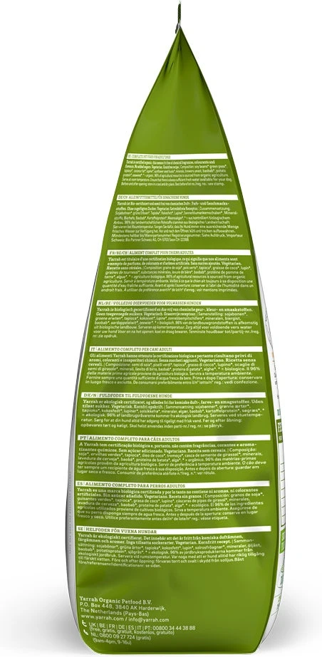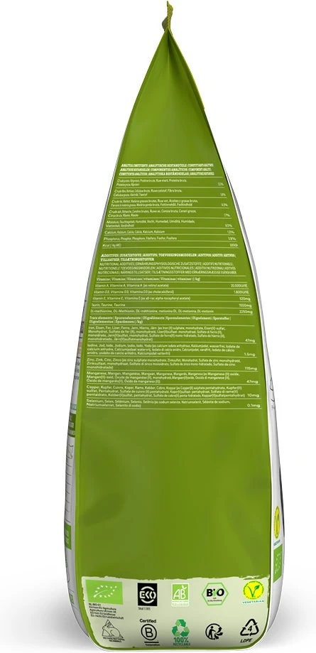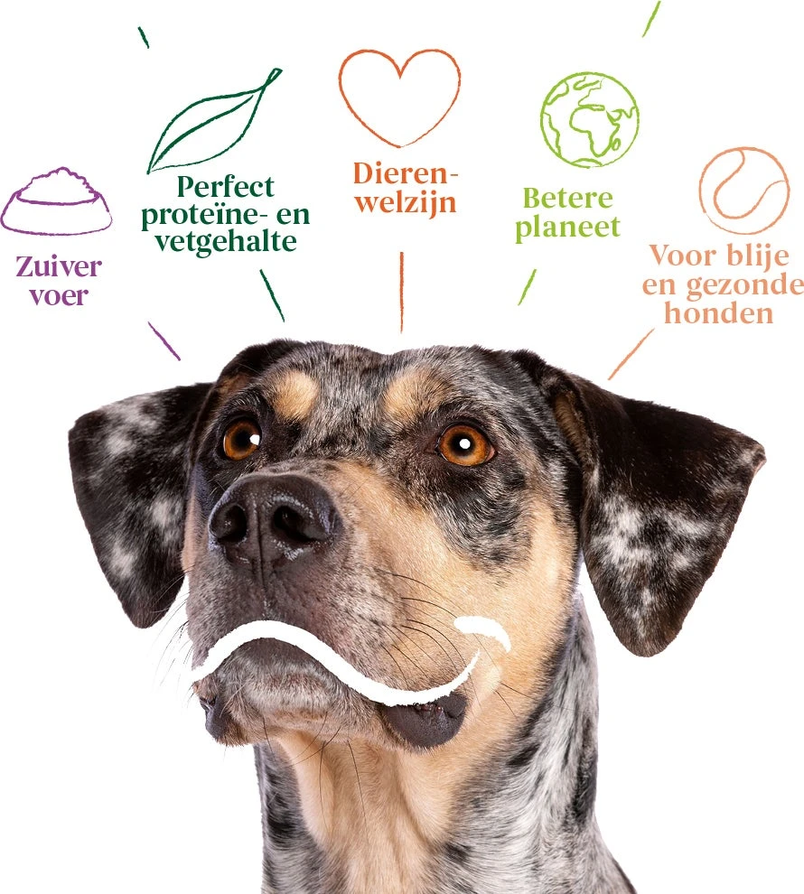 Zuiver biologisch voer en dus vrij van chemische geur-, kleur- en smaakstoffen, pesticiden en GMO. De best opneembare, plantaardige eiwitten zijn geselecteerd. Zo krijgt je hond precies binnen wat hij nodig heeft.